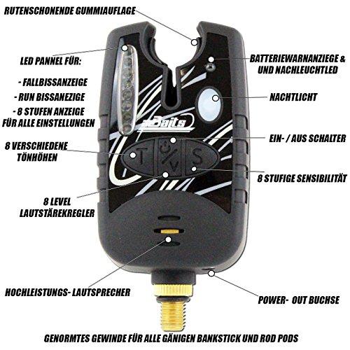 Der Bissanzeiger verfügt über sämtliche Funktionen und Einstellmöglichkeiten die man benötigt. Es kann die Lautstärke, Tonhöhe und die Sensibilität in 8 Stufen eingestellt werden. Die Einstellungen werden am Bissanzeiger mit einer LED-Skala angezeigt. Der Bissanzeiger kann komplett lautlos eingestellt werden. Die Nachleucht LED leuchtet für 20 Sekunden nach und ist gleichzeitig auch die Batteriewarnanzeige.