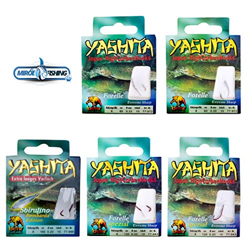 Set: 5 Packungen Angelhaken mit jeweils 10 High Carbon Japan Haken, getestet vom MiRoeFishing Team. Angelhakensortiment zum Forellenfischen, aber auch für andere Fische einsetzbar.