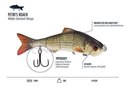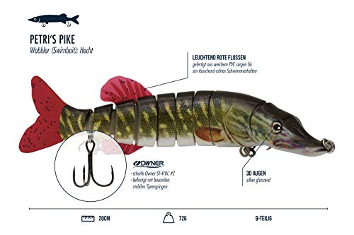Hecht: 20cm lang, 72 Gramm, 8 teilig, sinkend, weiche PVC-Flossen | Rotauge: 15cm, 30 Gramm, 4 teilig, sinkend, Rassel