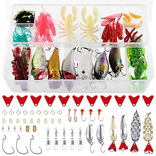 【100 Pcs Angelköder Tackle Box Kit】Qissep Angelgerät Set sammelt fast alles Zubehör einschließlich Angelköder, Haken, Free TackIe Box. Mit diesem brauchen Sie kein anderes Zubehör von anderen Anbietern zu kaufen. Einschließlich Frog Lures, Harte Köder, Spinnerbaits, Löffel Köder, Soft Lures, Popper, die es die mächtige Fischerei Fang Verführung macht.